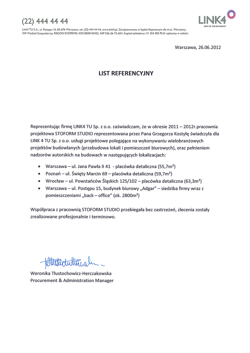 Reprezentując firmę LINK4 T.U. Sp. z o.o. zaświadczam, że w okresie 2011 - 2012r. pracownia projektowa STOFORM STUDIO reprezentowana przez Pana Grzegorza Kostyłę świadczyła dla LINK4 T.U. Sp. z o.o. usługi projektowe polegające na wykonaniu wielobranżowych projektów budowlanych ( przebudowa lokali usługowych i pomieszczeńbiurowych), oraz pełnieniem nadzorów autorskich na budowach w następujących lokalizacjach: