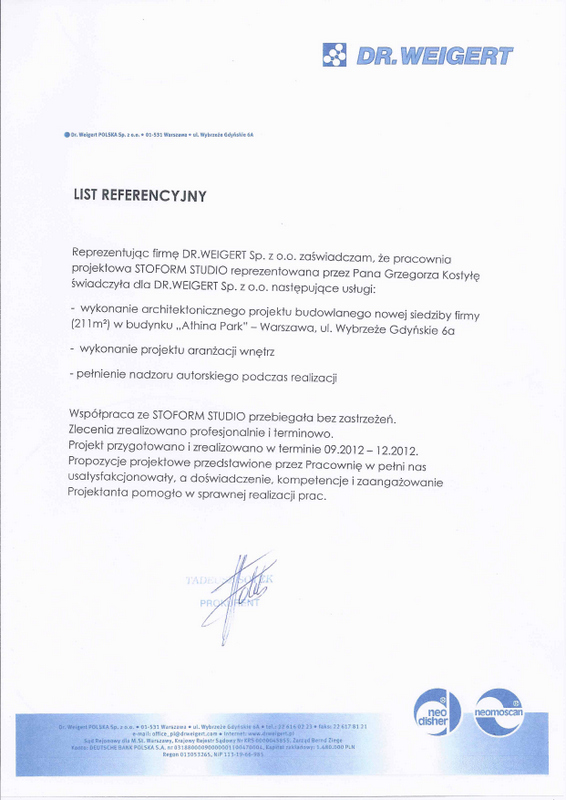 Reprezentując firmę DR.WEIGERT Sp. z o.o. zaświadczam, żę proacownia projektowa STOFORM STUDIO reprezentowana przez Pana Grzegorza Kostyłę świadczyła dla DR.WEIGERT Sp. z o.o. następujące usługi: