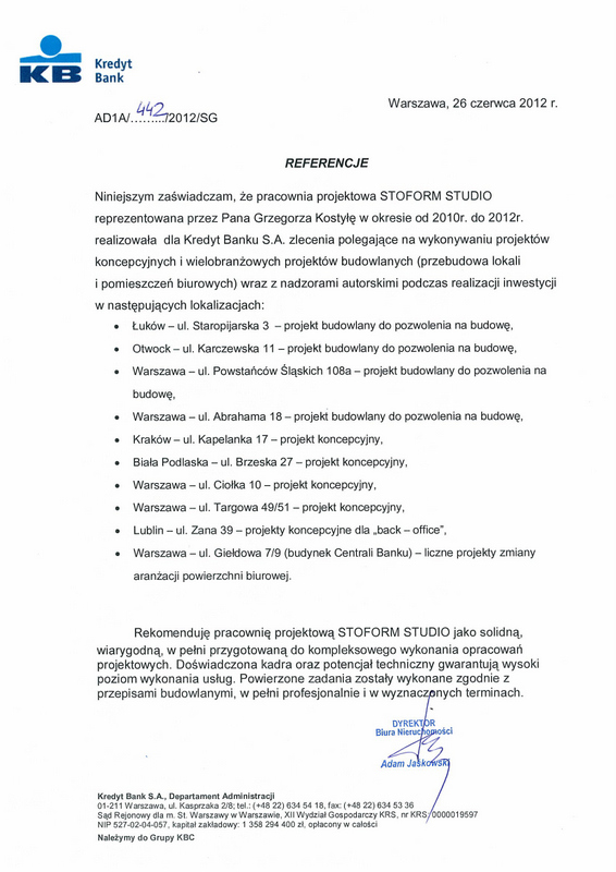 Niniejszym zaświadczam, że pracownia projektowa STOFORM STUDIO reprezentowana przez Pana Grzegorza Kostyłę w okresie od 2010 do 2012r. realizowała dla Kredyt Banku S.A. zlecenia polegające na wykonaniu projektów koncepcyjnych i wielobranżowych projektów budowlanych ( przebudowa lokali i pomieszczeń biurowych) wraz z nadzorami autorskimi podczas realizacji inwestycji w następujących lokalizacjach: