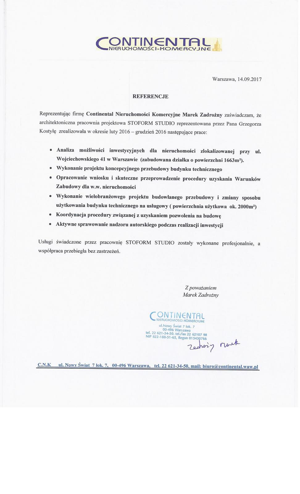 Reprezentując spółki celowe należące do BPH Funduszu Inwestycyjnego Zamkniętego Sektora Nieruchomości zarządzanego przez BPH Towarzystwo Funduszy Inwestycyjnych S.A. Grupa GE Capital zaświadczam, że pracownia projektowa STOFORM STUDIO reprezentowana przez Pana Grzegorza Kostyłę wykonywała w latach 2012 - 2014 liczne opracowania projektowe branży architektonicznej w następujących nieruchomościach:
