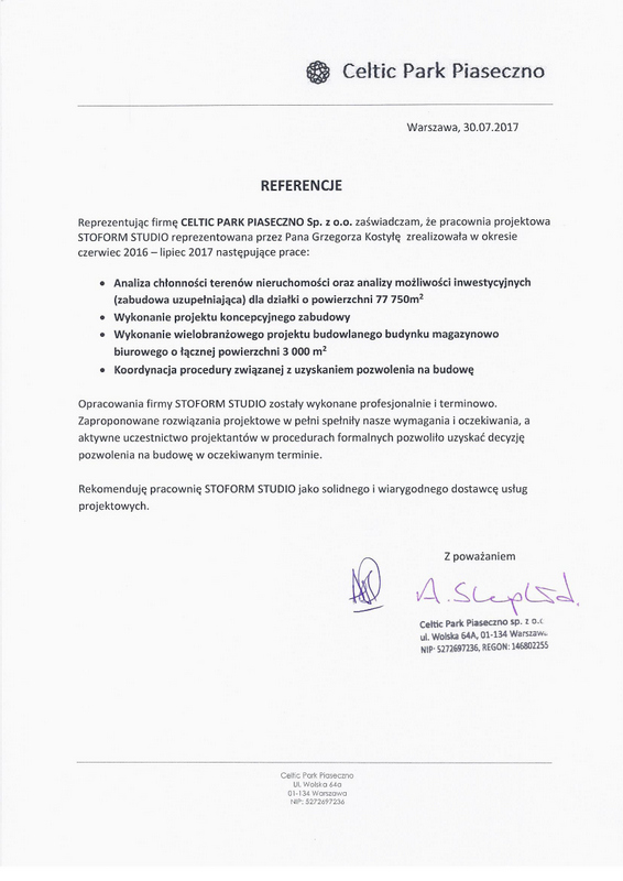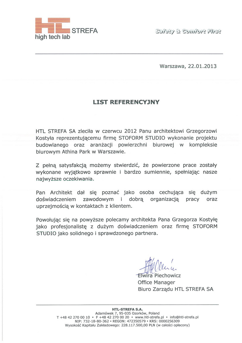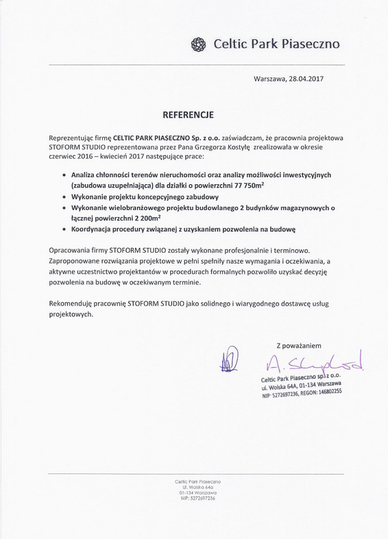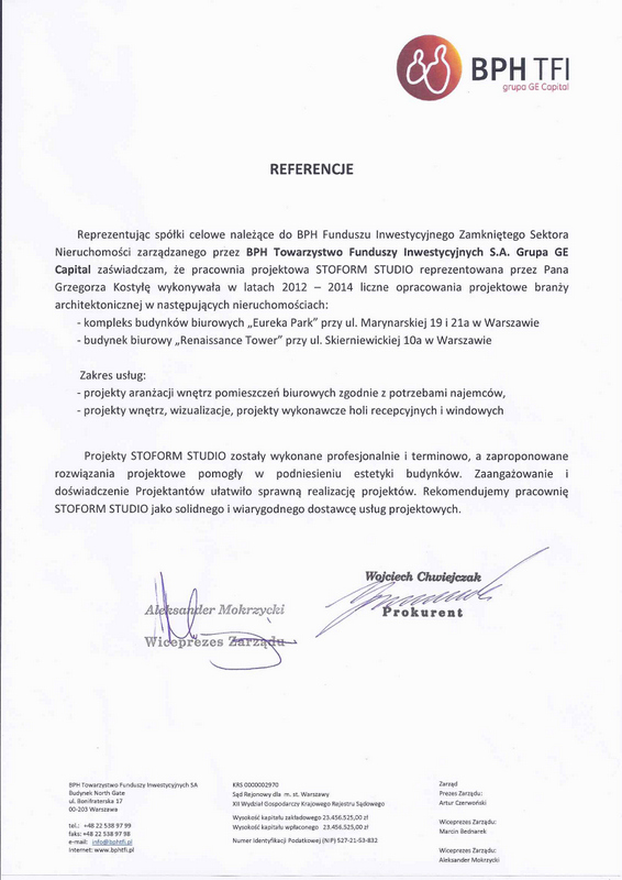 Reprezentując spółki celowe należące do BPH Funduszu Inwestycyjnego Zamkniętego Sektora Nieruchomości zarządzanego przez BPH Towarzystwo Funduszy Inwestycyjnych S.A. Grupa GE Capital zaświadczam, że pracownia projektowa STOFORM STUDIO reprezentowana przez Pana Grzegorza Kostyłę wykonywała w latach 2012 - 2014 liczne opracowania projektowe branży architektonicznej w następujących nieruchomościach: