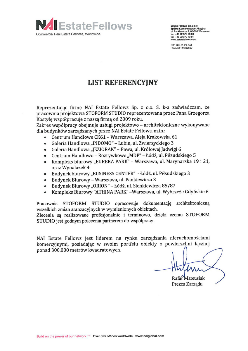 Reprezentując NAI Estate Fellows Sp. z o.o. Sp. K. zaświadczm, że pracownia projektowa STOFORM STUDIO reprezentowana przez Pana Grzegorza Kostyłę współpracuje z naszą firmą od 2009 roku.
