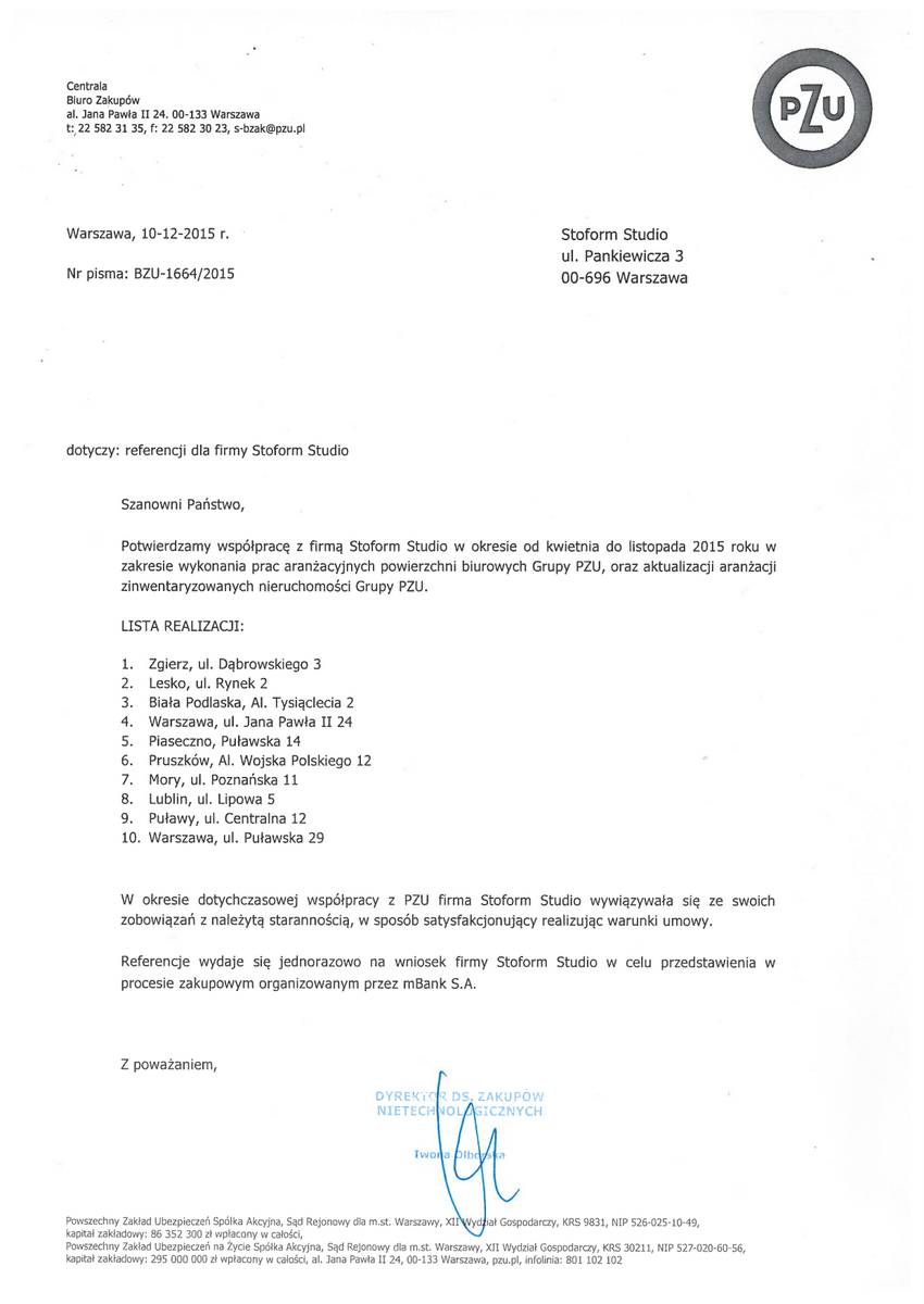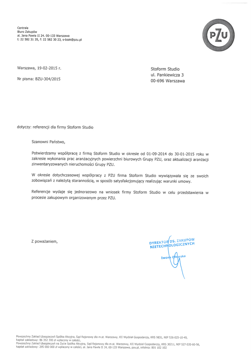 Potwierdzamy współpracę z firmą Stoform Studio w okresie od kwietnia do listopada 2015 roku w zakresie wykonania prac aranżacyjnych powierzchni biurowych grupy PZU, oraz aktualizacji aranżacji zinwentaryzowanych nieruchomości Grupy PZU.
