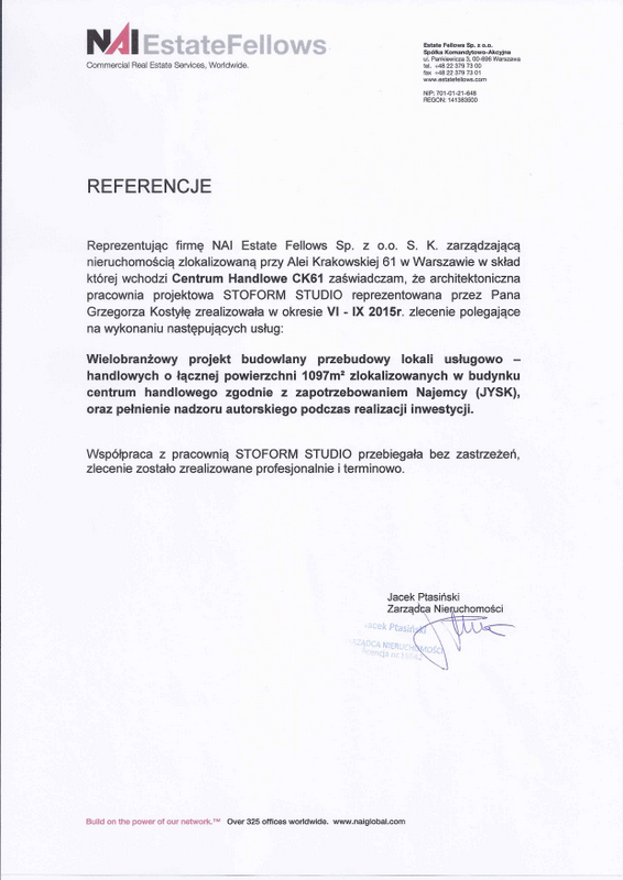 Reprezentując firmę NAI Estate Fellows Sp. z o.o. S.K. zarządzająca nieruchomością zlokalizowanąprzy Al. Krakowskiej 61 w Warszawie w skład której wchodzi Centrum Handlowe CK61 zaświadczam, że architektoniczna pracownia projektowa STOFORM STUDIO reprezentowana przez Pana Grzegorza kostyłę zrealizowała w okresie VI- IX 2015r. zlecenie polegające na wykonaniu następujących usług: