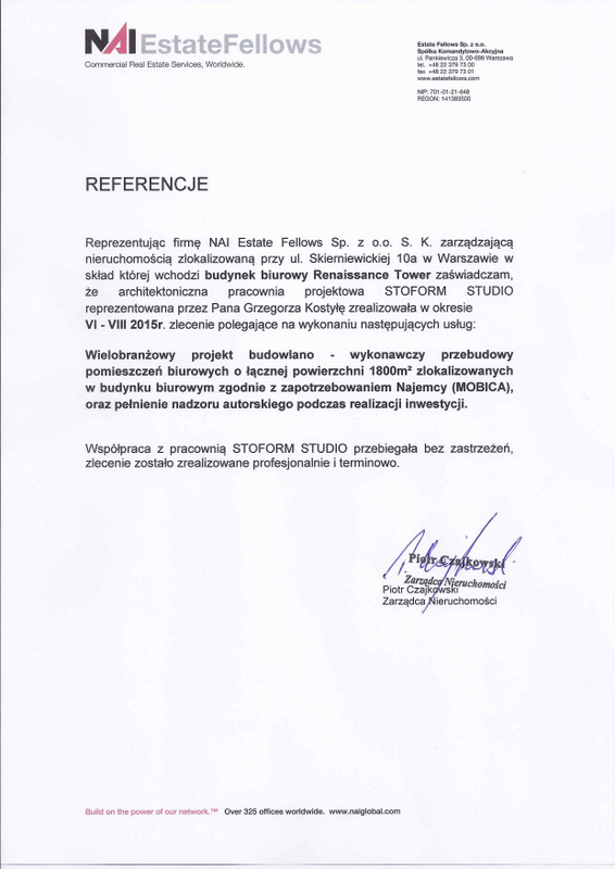 Reprezentując firmę NAI Estate Fellows Sp. z o.o. S.K. zarządzająca nieruchomością zlokalizowanąprzy ul. Skierniewickiej 10a w Warszawie w skład której wchodzi budynek biurowy Renaissance Tower zaświadczam, że architektoniczna pracownia projektowa STOFORM STUDIO reprezentowana przez Pana Grzegorza kostyłę zrealizowała w okresie VI-VIII 2015r. zlecenie polegające na wykonaniu następujących usług: