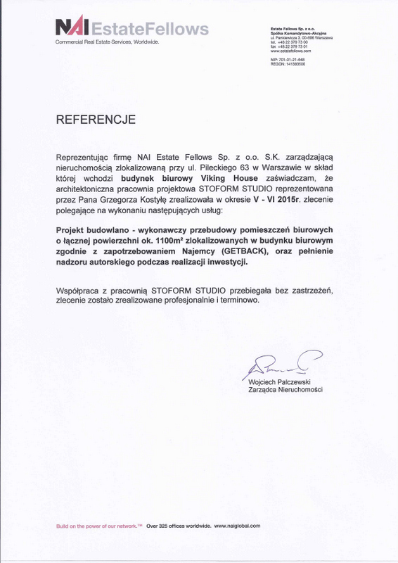 Reprezentując firmę NAI Estate Fellows Sp. z o.o. S.K. zarządzająca nieruchomością zlokalizowanąprzy ul. Pileckiego 63 w Warszawie w skład której wchodzi budynek biurowy Viking House zaświadczam, że architektoniczna pracownia projektowa STOFORM STUDIO reprezentowana przez Pana Grzegorza kostyłę zrealizowała w okresie V-VI 2015r. zlecenie polegające na wykonaniu następujących usług: