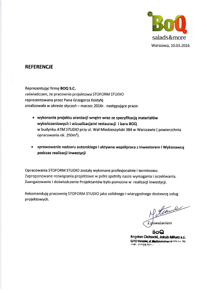 Rekomenduję pracownię STOFORM STUDIO jako solidnego i wiarygodnego dostawcę usług projektowych.