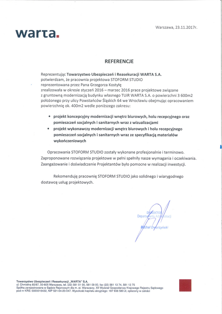 Reprezentując firmę LINK4 T.U. Sp. z o.o. zaświadczam, że w okresie 2011 - 2012r. pracownia projektowa STOFORM STUDIO reprezentowana przez Pana Grzegorza Kostyłę świadczyła dla LINK4 T.U. Sp. z o.o. usługi projektowe polegające na wykonaniu wielobranżowych projektów budowlanych ( przebudowa lokali usługowych i pomieszczeńbiurowych), oraz pełnieniem nadzorów autorskich na budowach w następujących lokalizacjach: